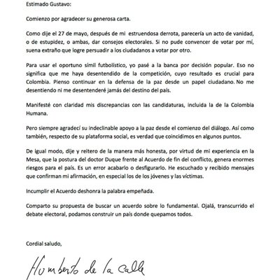 Estimado @petrogustavo, en respuesta a su carta: comparto su propuesta de buscar un acuerdo sobre lo fundamental. Ojalá, transcurrido el debate electoral, podamos construir un país donde quepamos todos.