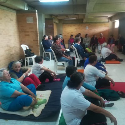 participan en una sesión de Yoga en la Escuela de lideres local.